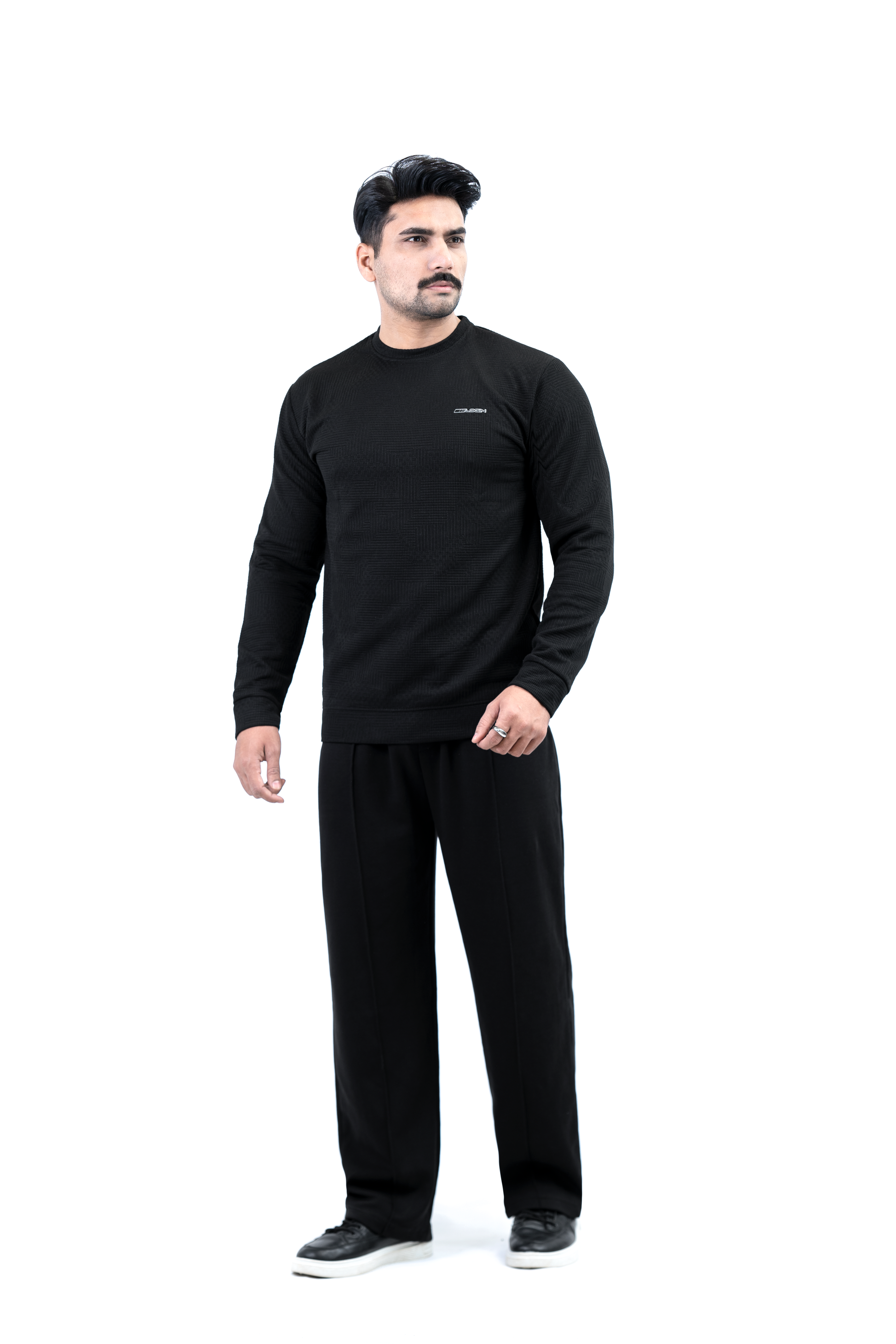 A classic black waffle-textured crewneck crafted from soft fleece-knit fabric for everyday comfort and warmth. The deep black tone adds a sleek, versatile look, while the raised waffle pattern gives it a premium, structured feel. Lightweight, cozy, and easy to style — perfect for layering or wearing on its own for a clean, modern winter outfit.
